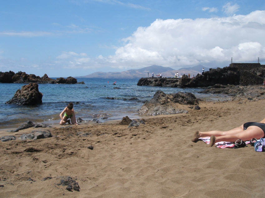 Playa Chica is a very small beach right in the heart of Old Town Puerto del Carmen. It is mostly used by locals and the various scuba diving schools, but it is a really cool little place. A bit rocky, but well protected by some interesting rock formations. One of our favourite places. There is a great little restaurant on the nearby pier, where you can get cheap beer, coffee, and the most amazing view of a sunset over the mountains. Playa Chica is just west of the Hotel Farionnes. From the centre of Old Town Puerto del Carmen take Calle Bajamar (the continuation of Reina Sofia) to the waterfront. Turn left, and follow the dirt path to the beach.