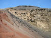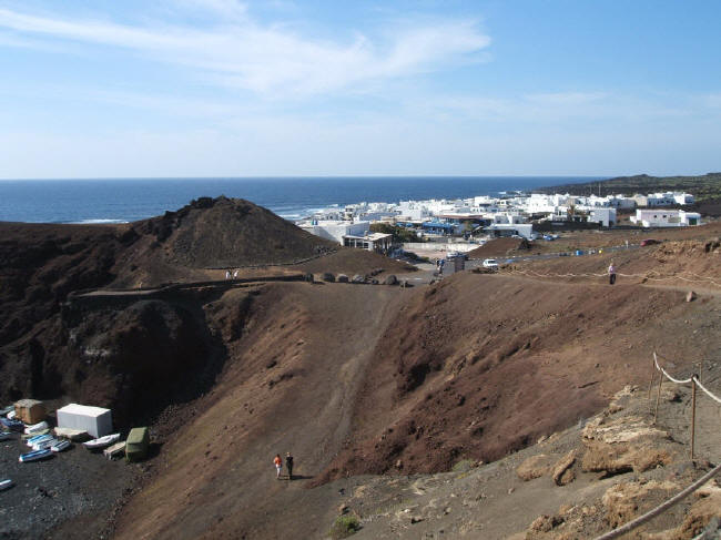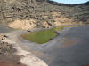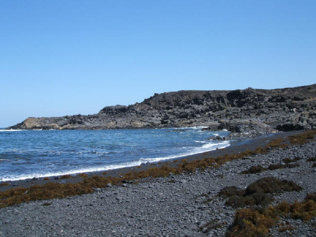 The town of El Golfo is a great place to watch the sunset while dining on fresh fish at a beachside cafe. Olivina is found in the mountains, but I wouldn't expect to see anything of any size after they have been combed over by the thousands of tourists before you. However, if you look in some of the lava rocks, you will see some small veins of the semi precious stone. The deep green lagoon is a volcanic crater filled by the sea from an underground channel, and is a stunning contrast to the black sand beach, the red mountains, and the blue sky.